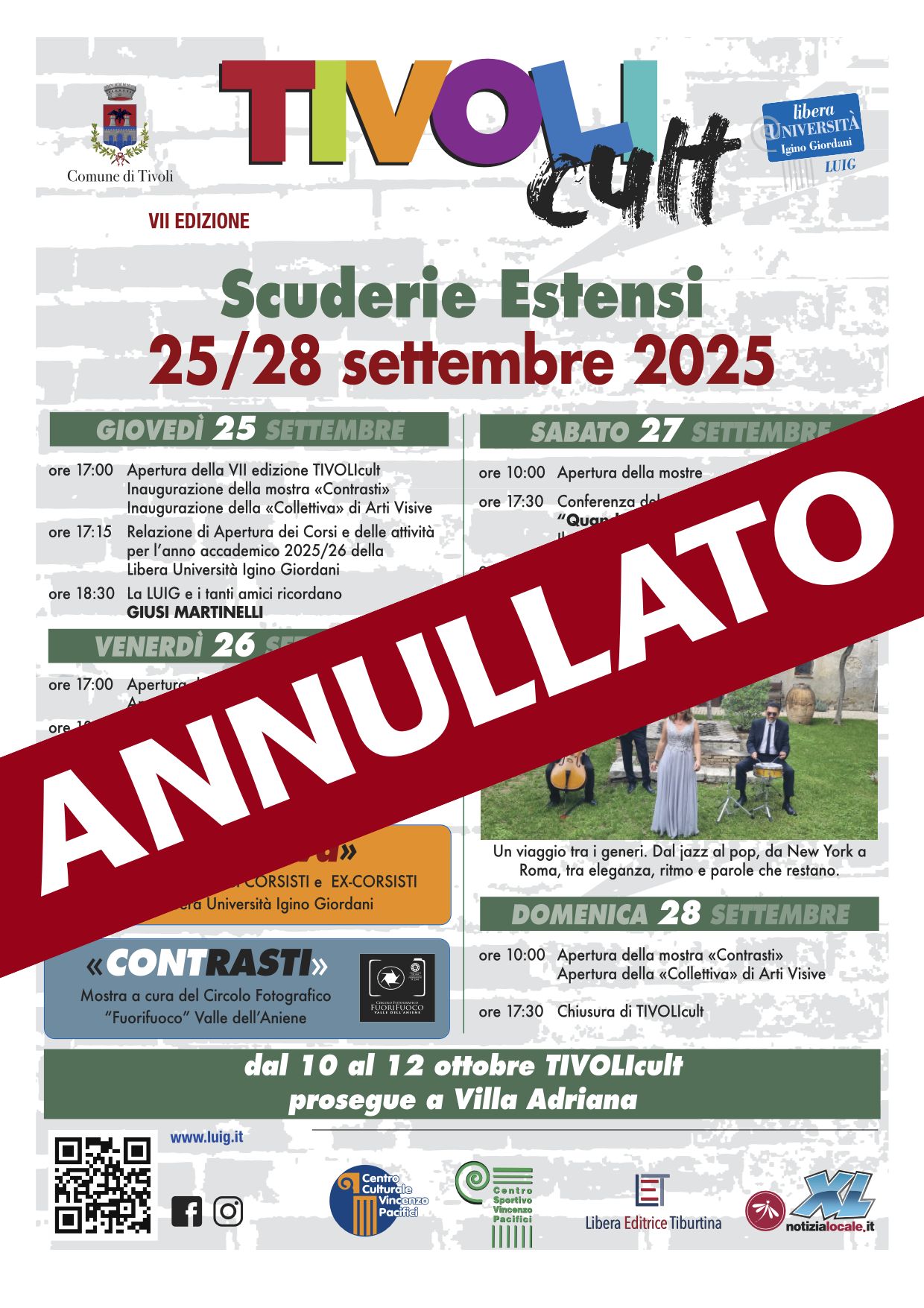 La Libera Università Igino Giordani – APS informa con profondo rammarico che gli eventi di TIVOLIcult previsti a Tivoli nelle giornate del 25, 26, 27 e 28 settembre 2025 sono annullati, a seguito della revoca del patrocinio comunale a tre delle quattro giornate e della concessione gratuita delle Scuderie Estensi comunicata a meno di due giorni dallavvio della manifestazione.