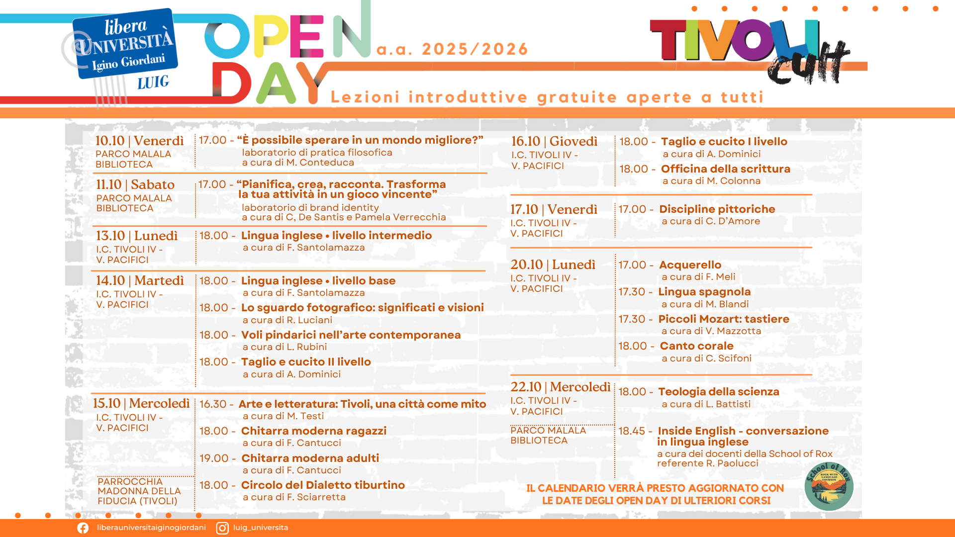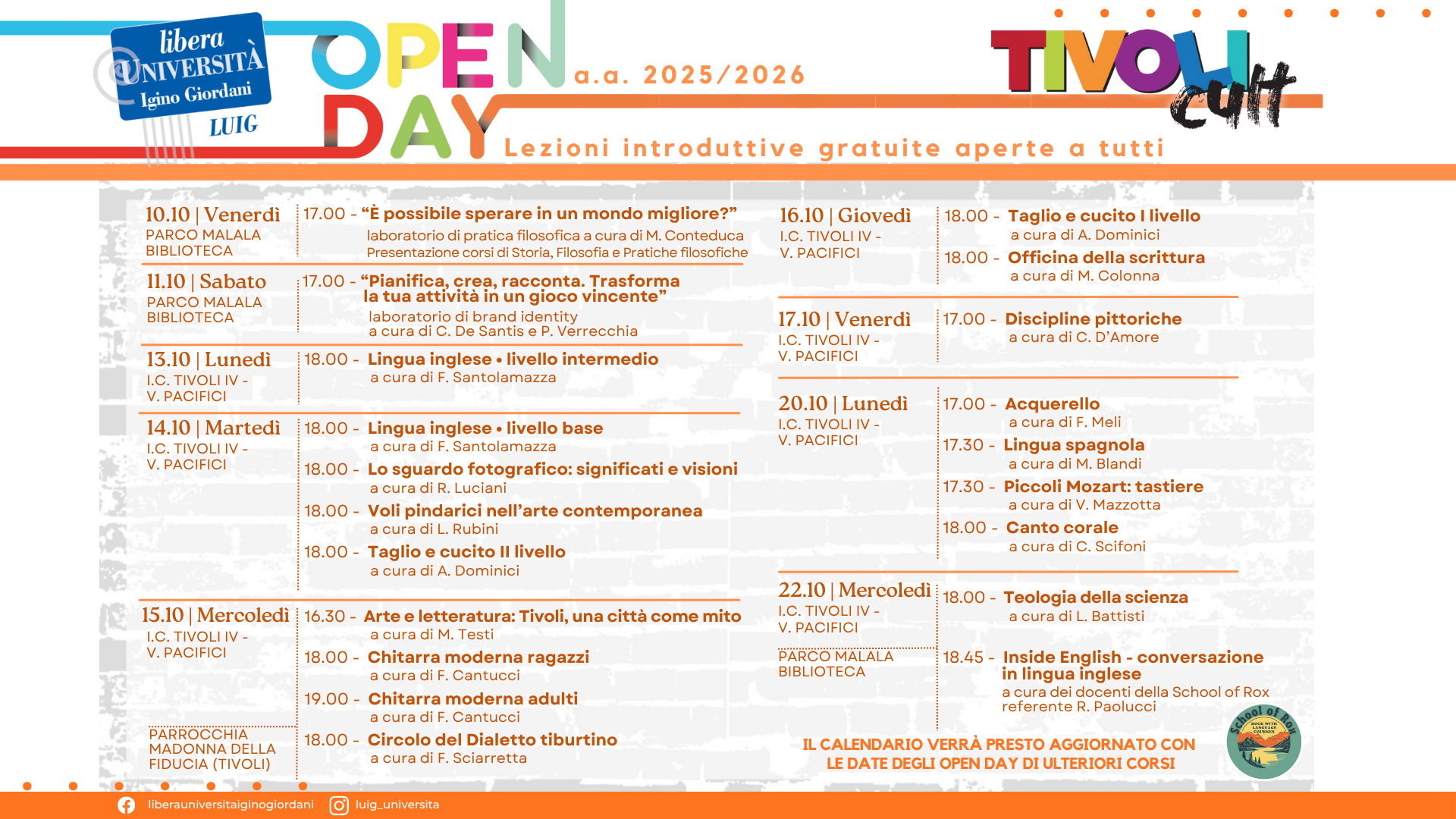 La VI edizione di TIVOLIcult ha dato ufficialmente il via al periodo di presentazione delle attività della Libera Università Igino Giordani. Nel mese di ottobre si rinnova l’appuntamento con gli open day che vi permetteranno di entrare in contatto con la nostra realtà e con la nostra offerta formativa (consultabile cliccando qui).