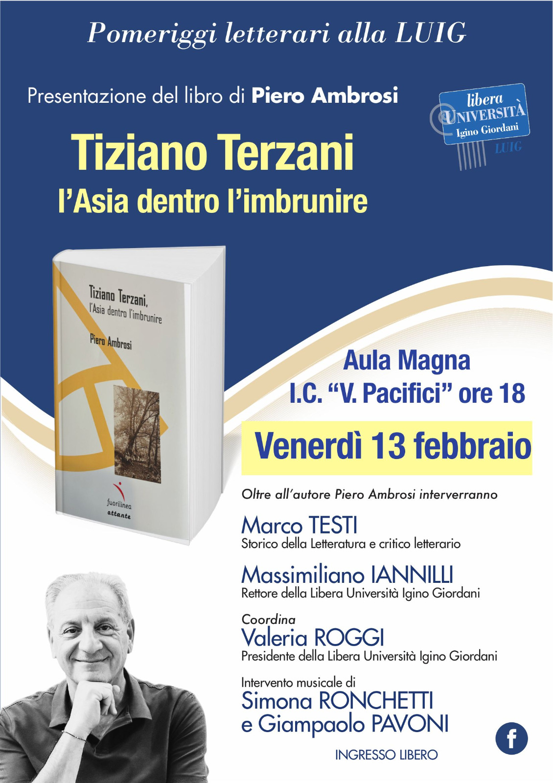 Il secondo incontro è previsto per venerdì 13 febbraio alle ore 18.00, presso l’Aula Magna dell’Istituto Comprensivo Tivoli IV. In questa occasione sarà con noi Piero Ambrosi, che dialogherà con Massimiliano Iannilli e Marco Testi a partire dal suo libro “L’Asia dentro l’imbrunire” dedicato alla figura e all’esperienza di Tiziano Terzani, grande giornalista e pensatore del nostro tempo.