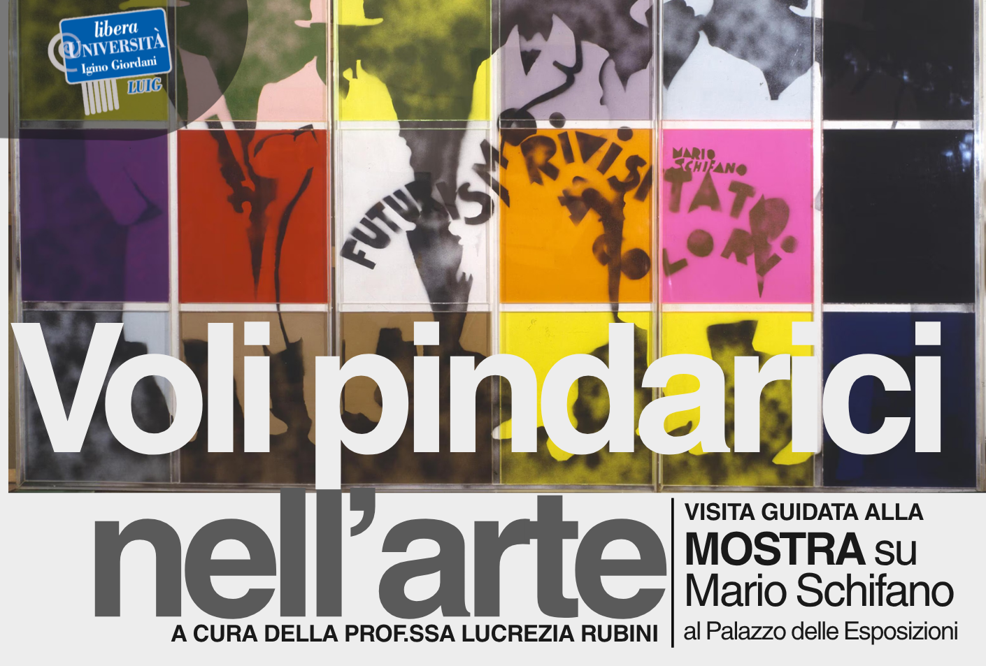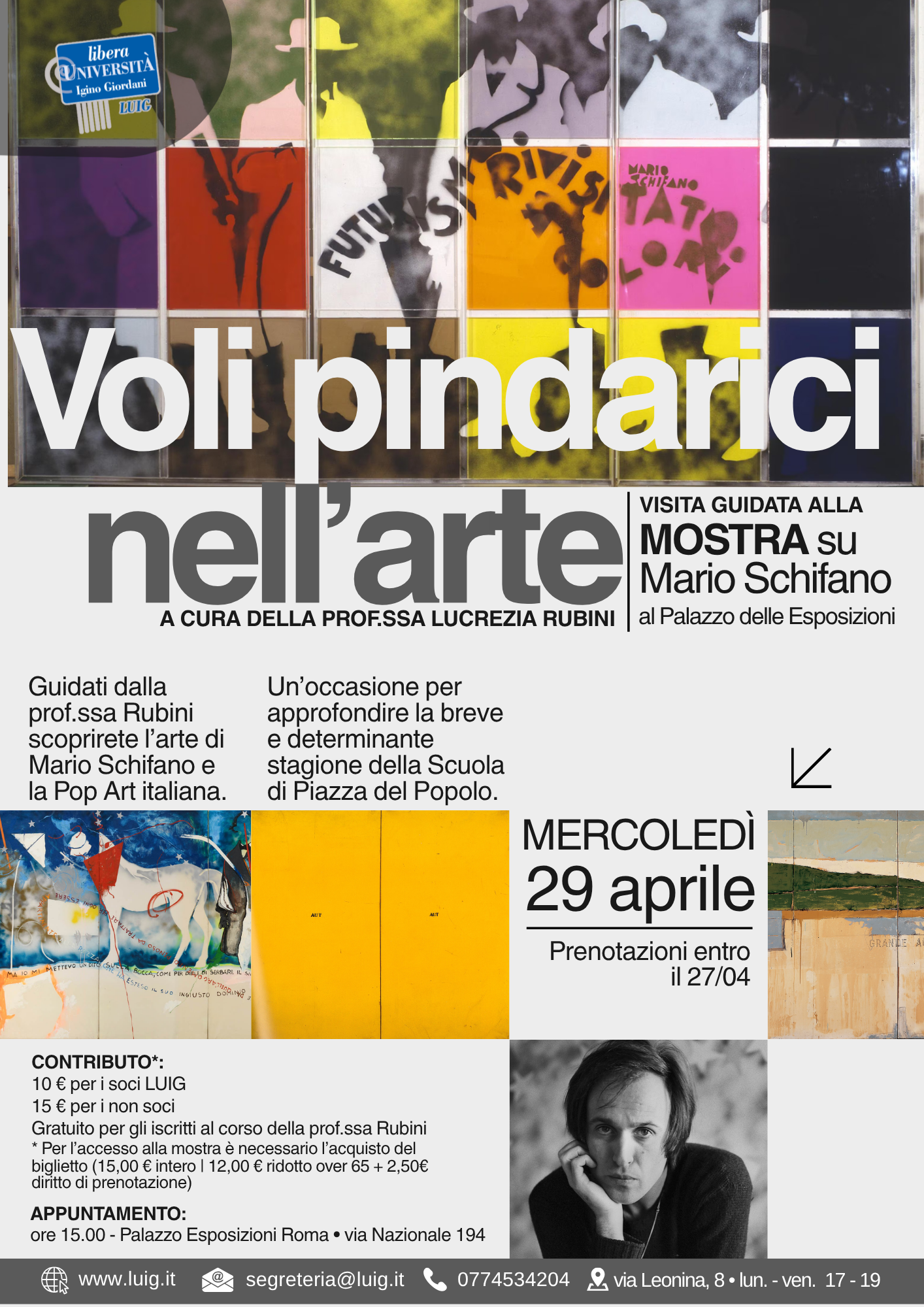 Nell’ambito del corso Voli pindarici nell’arte, condotto dalla professoressa Lucrezia Rubini, la Libera Università Igino Giordani propone un’esperienza imperdibile: la visita guidata alla mostra dedicata a Mario Schifano presso il Palazzo delle Esposizioni di Roma.